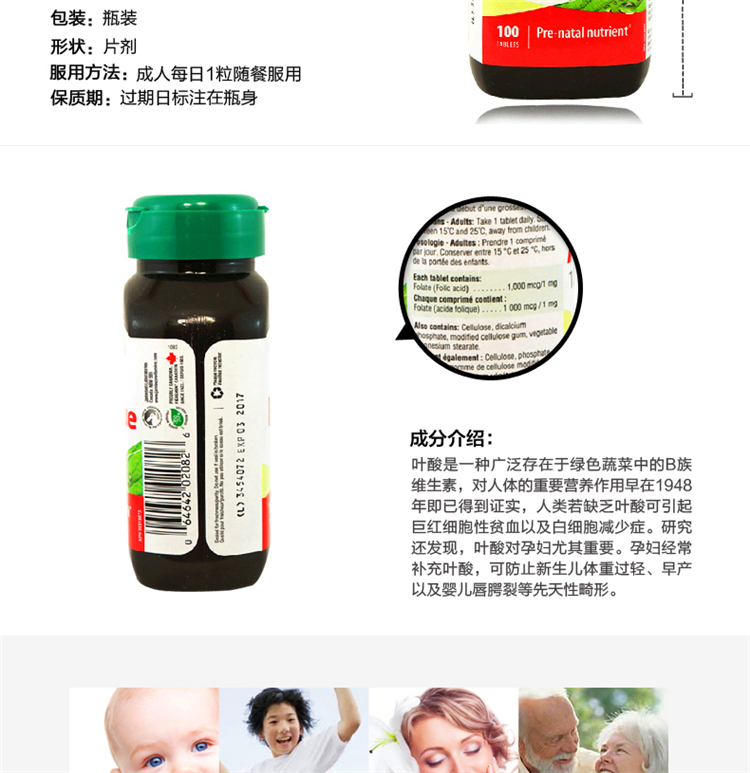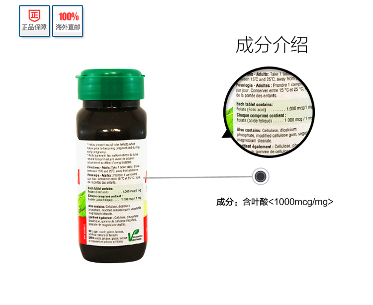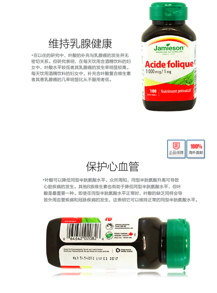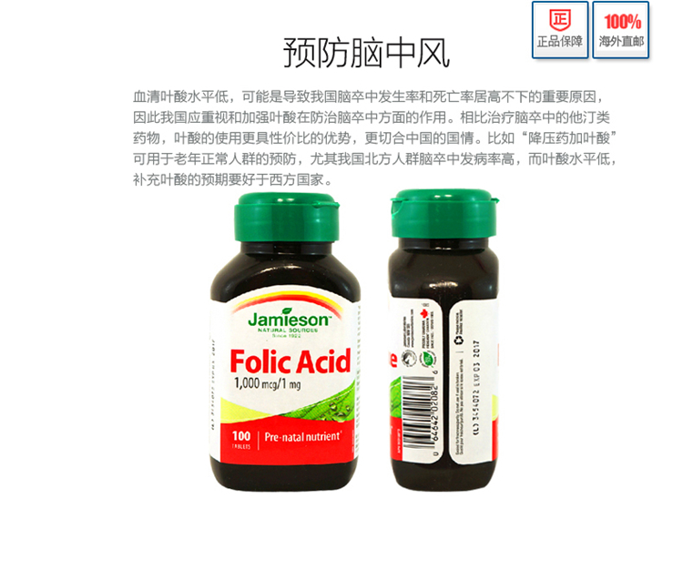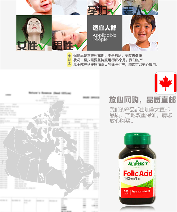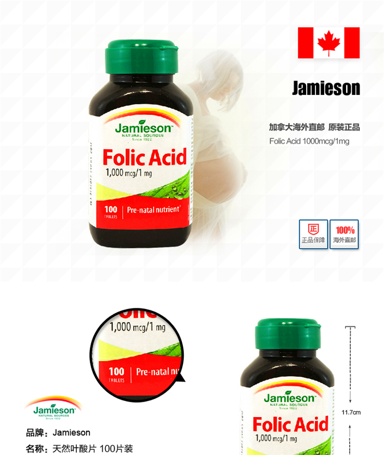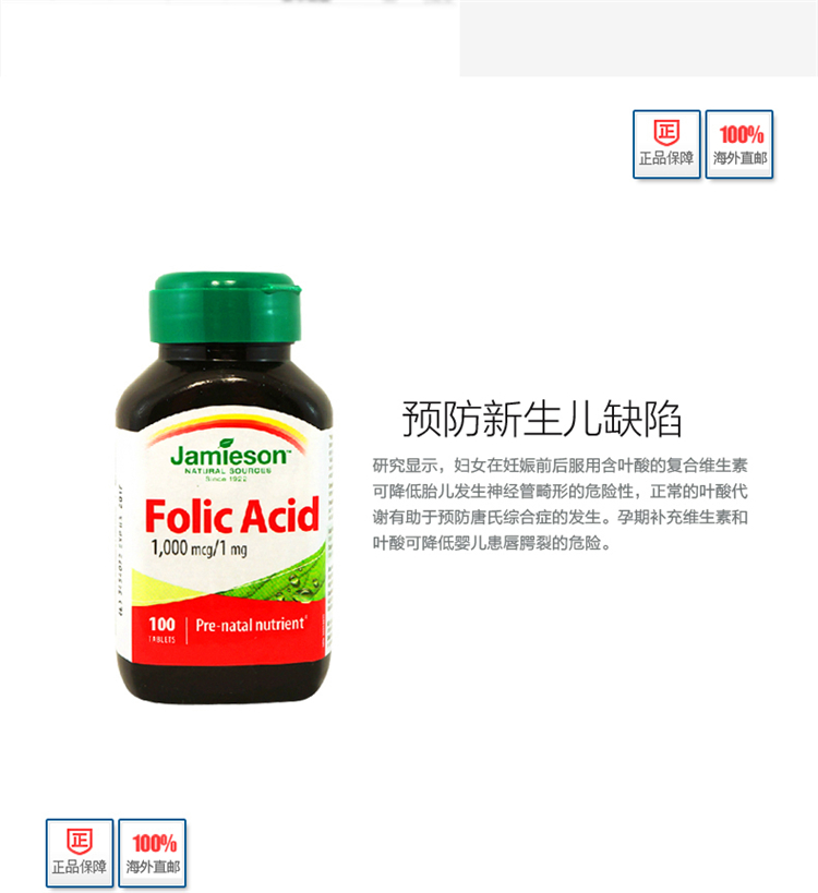 商品名称:【全球购】【加拿大直邮】Jamieson/健美生 叶酸片1毫克 备孕期专用叶酸片 备孕期