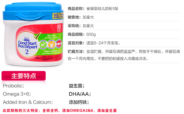 商品名称:【全球购】【加拿大直邮】雀巢nestle婴儿奶粉Good Start 2段