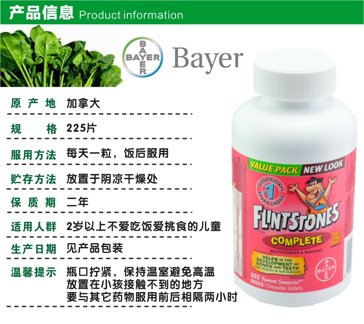 商品名称:【全球购】【加拿大直邮】Bayer Flint拜耳儿童复合维生素矿物质咀嚼片