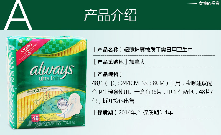 【产品名称】加拿大版 Always UltraThin超薄护翼日用卫生巾
