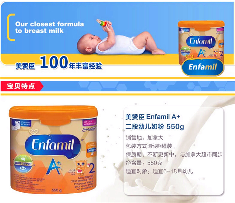 商品名称:【全球购】【加拿大直邮】美赞臣2段Enfamil A+婴儿奶粉 550克 二段1罐装