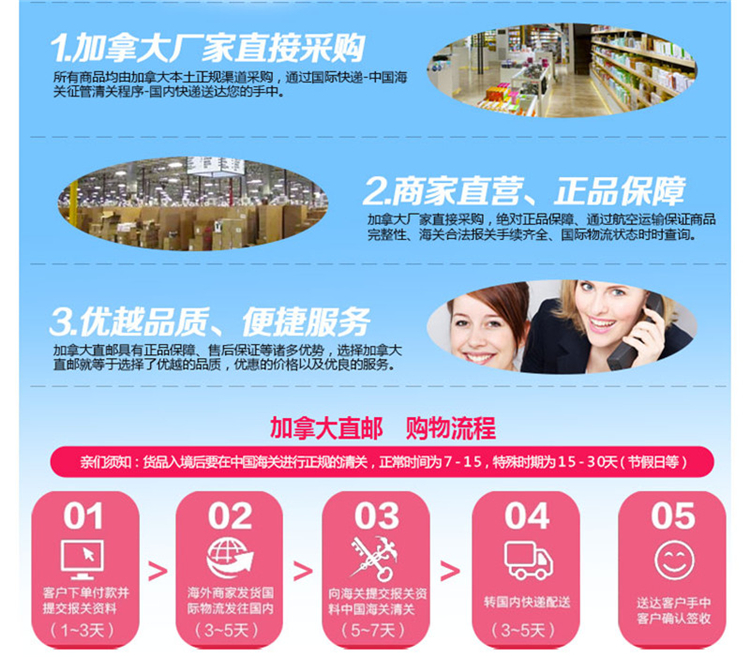 本店店内所有商品均采用加拿大直邮方式快递到国内,根据中华人民共和国海关规定,要求所有收件人必须提供身份证正反面复印件,这是必须的清关资料。发货后请您务必尽快上传,请在身份证正反面空白处填写"仅供清关使用"字样。如果由于您没有及时上传身份信息而导致清关无法正常进行,由此造成的清关时间延长,本店无法负责!谢谢理解!